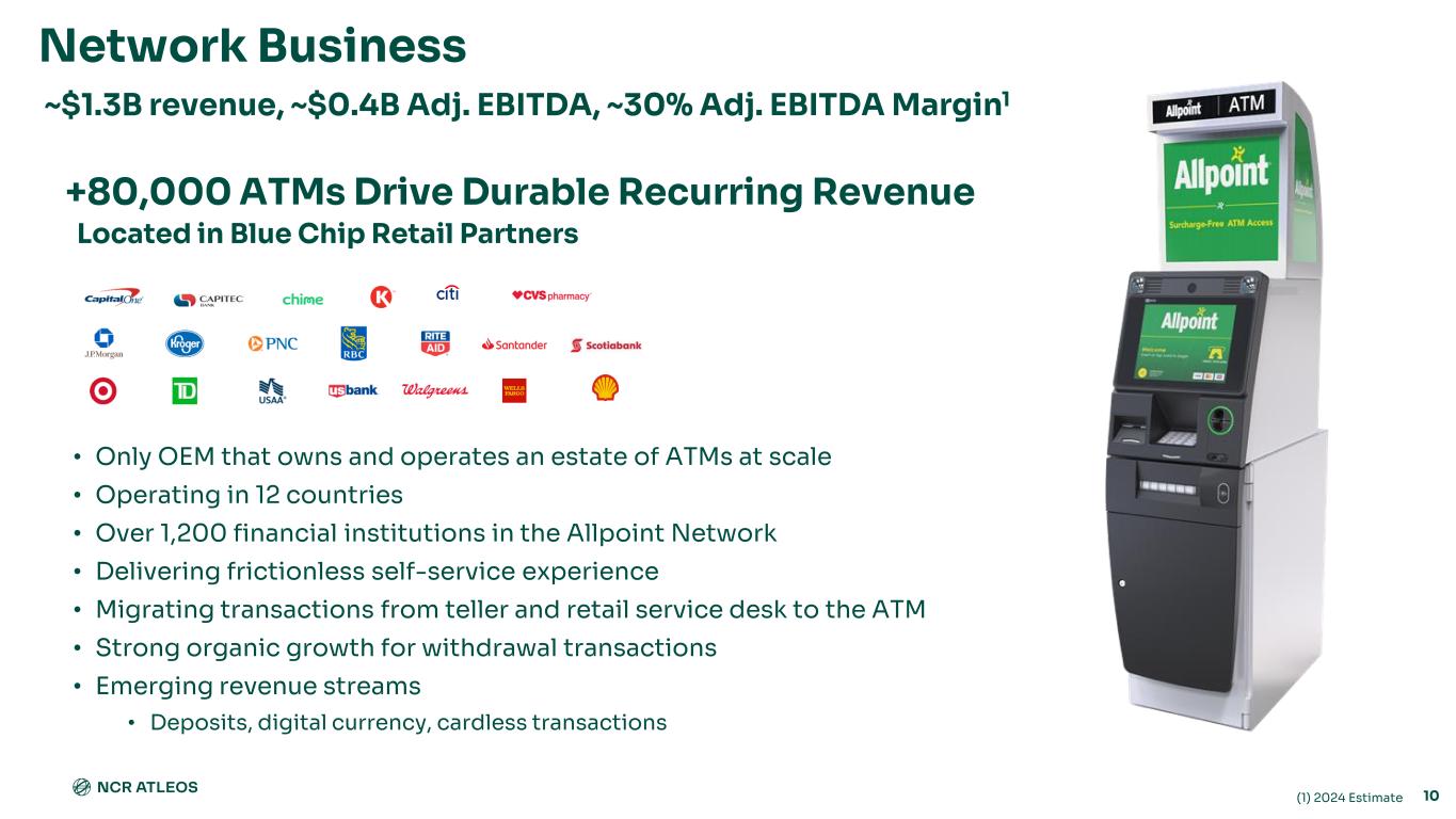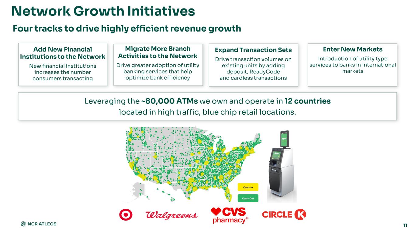 10 Network Business • Only OEM that owns and operates an estate of ATMs at scale • Operating in 12 countries • Over 1,200 financial institutions in the Allpoint Network • Delivering frictionless self-service experience • Migrating transactions from teller and retail service desk to the ATM • Strong organic growth for withdrawal transactions • Emerging revenue streams • Deposits, digital currency, cardless transactions Located in Blue Chip Retail Partners +80,000 ATMs Drive Durable Recurring Revenue ~$1.3B revenue, ~$0.4B Adj. EBITDA, ~30% Adj. EBITDA Margin1 (1) 2024 Estimate