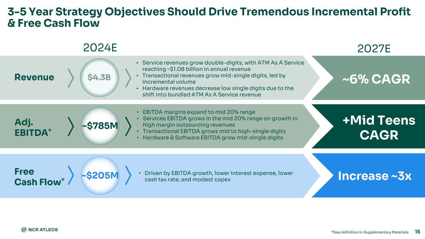 ~402k ~80k ~90k ~28k ~332k ~88k Significant Runway For Strong Long-Term Profit and Cash Flow Growth 14 2024E ATM Services Installed Base ~600k Units 3-5 Year Projected ATM Services Installed Base ~620k Units Full Outsourcing (ATMaaS) Full Outsourcing (ATMaaS) Managed Services (ATMaaS) Managed Services (ATMaaS) Standard Break/fix Network ATMaaS 67% 54% Outsourced Solutions ~200k (ATMaaS) Executing our 3–5 year objectives should drive exceptional profit and free cash flow growth, and still leaves a large addressable market opportunity for outsourced services Source: Company Estimates