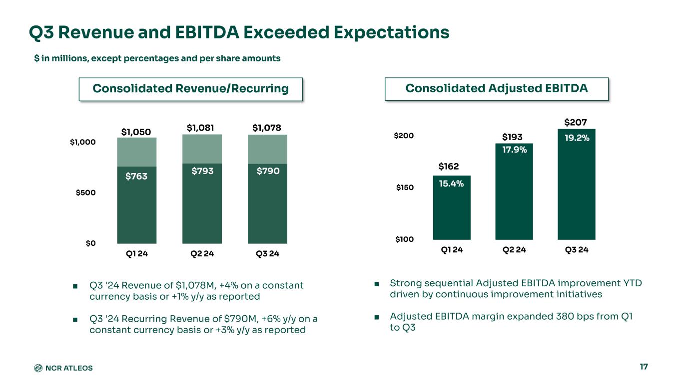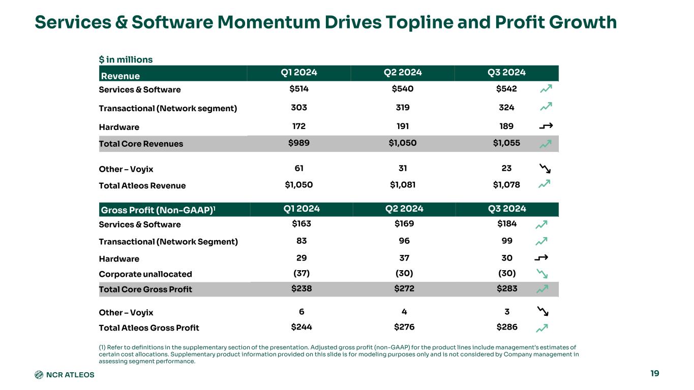 Q3 2024 % of Revenue Q2 2024 % of Revenue Q1 2024 % of Revenue Q3 2023 % of Revenue Net Income Attributable to Atleos (GAAP) $24 2.2% $29 2.7% $(8) (0.8)% $(58) (5.4)% Pension Mark-to-Market Adjustments — — % — — % — — % (6) (0.6)% Transformation & Restructuring Costs 7 0.7% 6 0.6% 1 0.1% 1 0.1% Acquisition-Related Amortization of Intangibles 24 2.2% 23 2.1% 25 2.4% 24 2.2% Acquisition-Related Costs (1) (0.1)% (4) (0.4)% — — % — — % Separation Costs 5 0.5% 6 0.6% 9 0.8% 46 4.3% Interest Expense 79 7.3% 79 7.3% 79 7.5% 6 0.6% Interest Income (1) (0.1)% (2) (0.2)% (2) (0.2)% — — % Depreciation and Amortization 45 4.2% 43 4.0% 44 4.2% 38 3.6% Income Taxes 14 1.3% 4 0.4% 4 0.4% 147 13.8% Stock-Based Compensation Expense 9 0.8% 9 0.8% 10 1.0% 12 1.1% Voyix Environmental Indemnification Expense 2 0.2% — — % — — % — — % Adjusted EBITDA (non-GAAP) $207 19.2% $193 17.9% $162 15.4% $210 19.7% GAAP TO NON-GAAP RECONCILIATION $ in millions 28