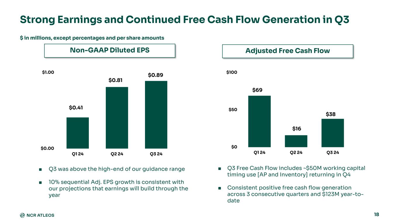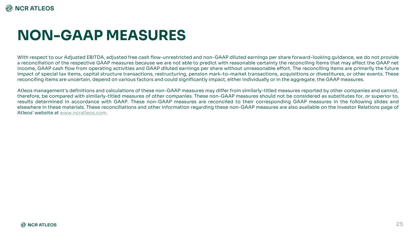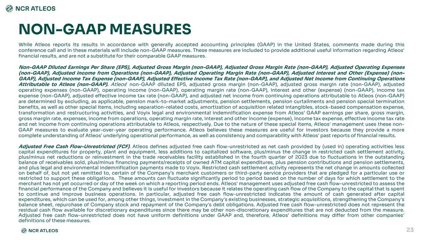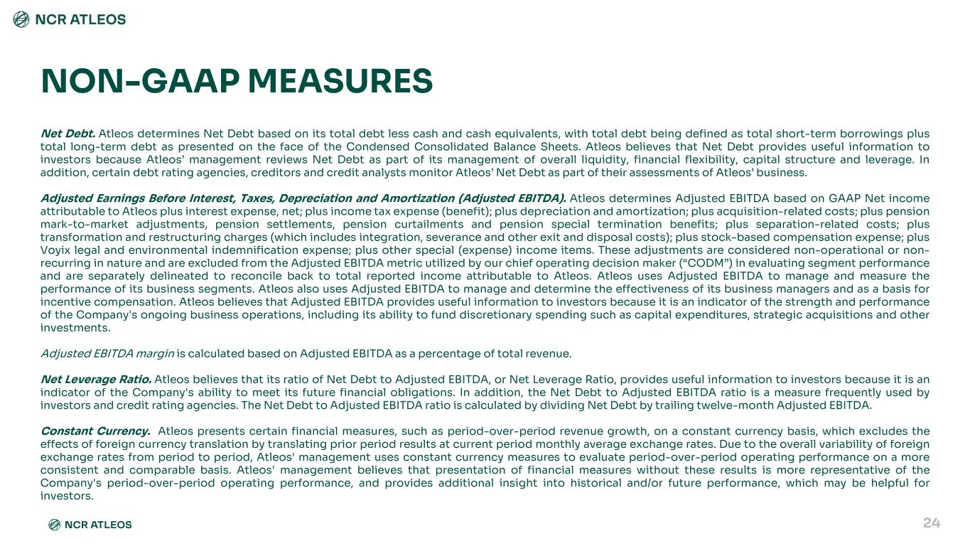 While Atleos reports its results in accordance with generally accepted accounting principles (GAAP) in the United States, comments made during this conference call and in these materials will include non-GAAP measures. These measures are included to provide additional useful information regarding Atleos' financial results, and are not a substitute for their comparable GAAP measures. Non-GAAP Diluted Earnings Per Share (EPS), Adjusted Gross Margin (non-GAAP), Adjusted Gross Margin Rate (non-GAAP), Adjusted Operating Expenses (non-GAAP), Adjusted Income from Operations (non-GAAP), Adjusted Operating Margin Rate (non-GAAP), Adjusted Interest and Other (Expense) (non- GAAP), Adjusted Income Tax Expense (non-GAAP), Adjusted Effective Income Tax Rate (non-GAAP), and Adjusted Net Income from Continuing Operations Attributable to Atleos (non-GAAP). Atleos’ non-GAAP diluted EPS, adjusted gross margin (non-GAAP), adjusted gross margin rate (non-GAAP), adjusted operating expenses (non-GAAP), operating income (non-GAAP), operating margin rate (non-GAAP), interest and other (expense) (non-GAAP), income tax expense (non-GAAP), adjusted effective income tax rate (non-GAAP), and adjusted net income from continuing operations attributable to Atleos (non-GAAP) are determined by excluding, as applicable, pension mark-to-market adjustments, pension settlements, pension curtailments and pension special termination benefits, as well as other special items, including separation-related costs, amortization of acquisition related intangibles, stock-based compensation expense, transformation and restructuring activities, and Voyix legal and environmental indemnification expense from Atleos’ GAAP earnings per share, gross margin, gross margin rate, expenses, income from operations, operating margin rate, interest and other income (expense), income tax expense, effective income tax rate and net income from continuing operations attributable to Atleos, respectively. Due to the nature of these special items, Atleos' management uses these non- GAAP measures to evaluate year-over-year operating performance. Atleos believes these measures are useful for investors because they provide a more complete understanding of Atleos' underlying operational performance, as well as consistency and comparability with Atleos' past reports of financial results. Adjusted Free Cash Flow-Unrestricted (FCF). Atleos defines adjusted free cash flow-unrestricted as net cash provided by (used in) operating activities less capital expenditures for property, plant and equipment, less additions to capitalized software, plus/minus the change in restricted cash settlement activity, plus/minus net reductions or reinvestment in the trade receivables facility established in the fourth quarter of 2023 due to fluctuations in the outstanding balance of receivables sold, plus/minus financing payments/receipts of owned ATM capital expenditures, plus pension contributions and pension settlements, and plus legal and environmental indemnification payments made to Voyix. Restricted cash settlement activity represents the net change in amounts collected on behalf of, but not yet remitted to, certain of the Company’s merchant customers or third-party service providers that are pledged for a particular use or restricted to support these obligations. These amounts can fluctuate significantly period to period based on the number of days for which settlement to the merchant has not yet occurred or day of the week on which a reporting period ends. Atleos' management uses adjusted free cash flow-unrestricted to assess the financial performance of the Company and believes it is useful for investors because it relates the operating cash flow of the Company to the capital that is spent to continue and improve business operations. In particular, adjusted free cash flow-unrestricted indicates the amount of cash generated after capital expenditures, which can be used for, among other things, investment in the Company's existing businesses, strategic acquisitions, strengthening the Company's balance sheet, repurchase of Company stock and repayment of the Company's debt obligations. Adjusted free cash flow-unrestricted does not represent the residual cash flow available for discretionary expenditures since there may be other non-discretionary expenditures that are not deducted from the measure. Adjusted free cash flow-unrestricted does not have uniform definitions under GAAP and, therefore, Atleos' definitions may differ from other companies' definitions of these measures. NON-GAAP MEASURES 23