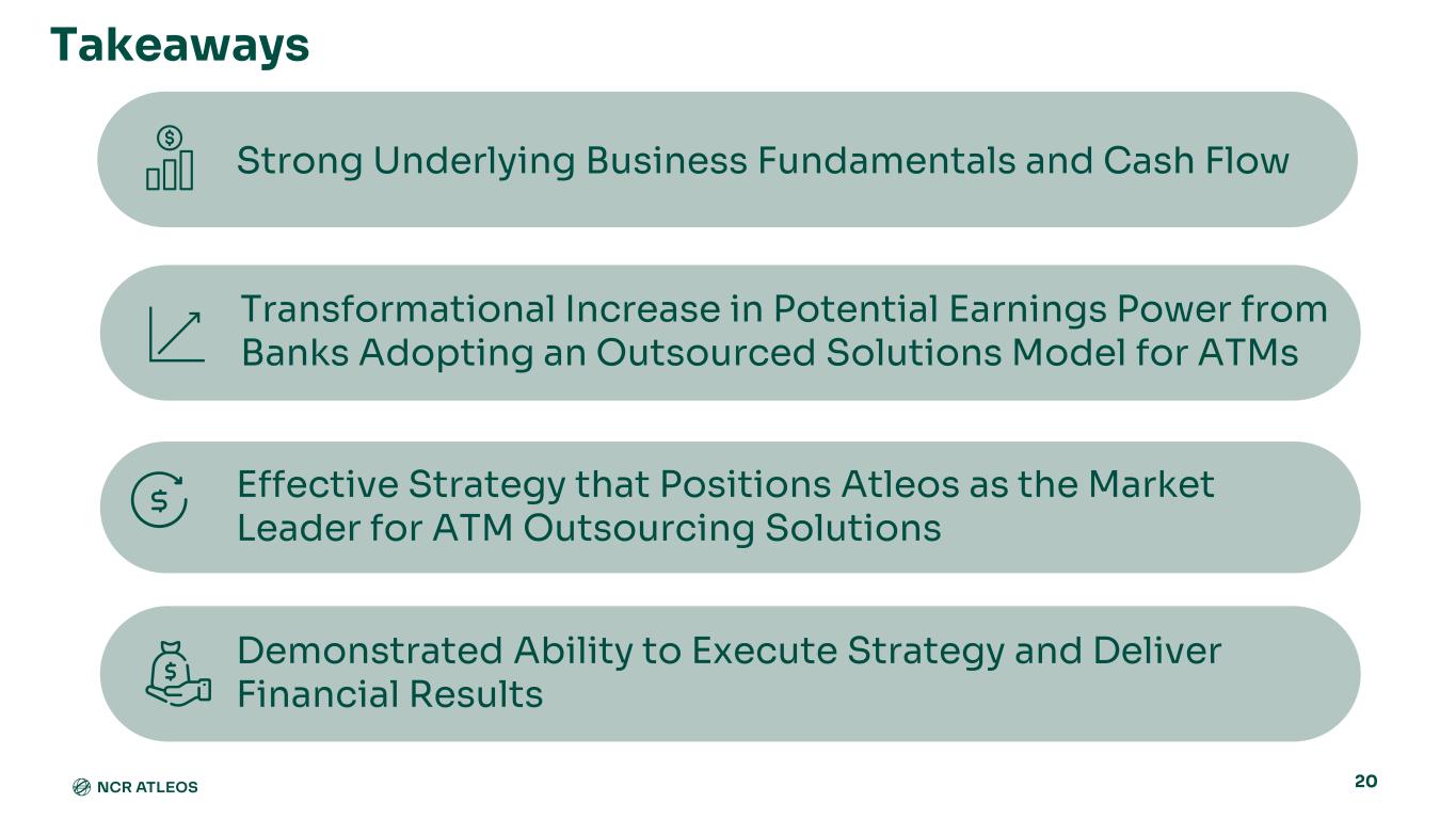 Effective Strategy that Positions Atleos as the Market Leader for ATM Outsourcing Solutions Transformational Increase in Potential Earnings Power from Banks Adopting an Outsourced Solutions Model for ATMs Strong Underlying Business Fundamentals and Cash Flow Demonstrated Ability to Execute Strategy and Deliver Financial Results Takeaways 20