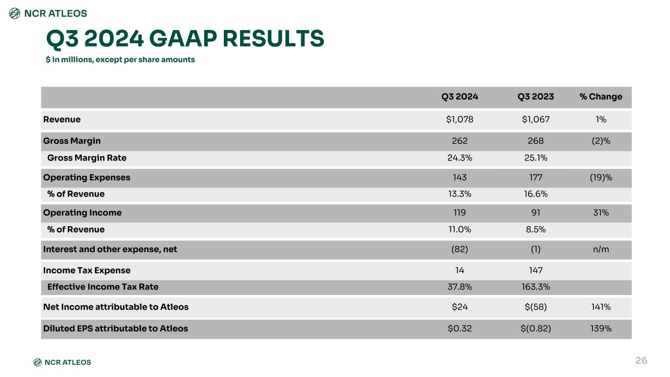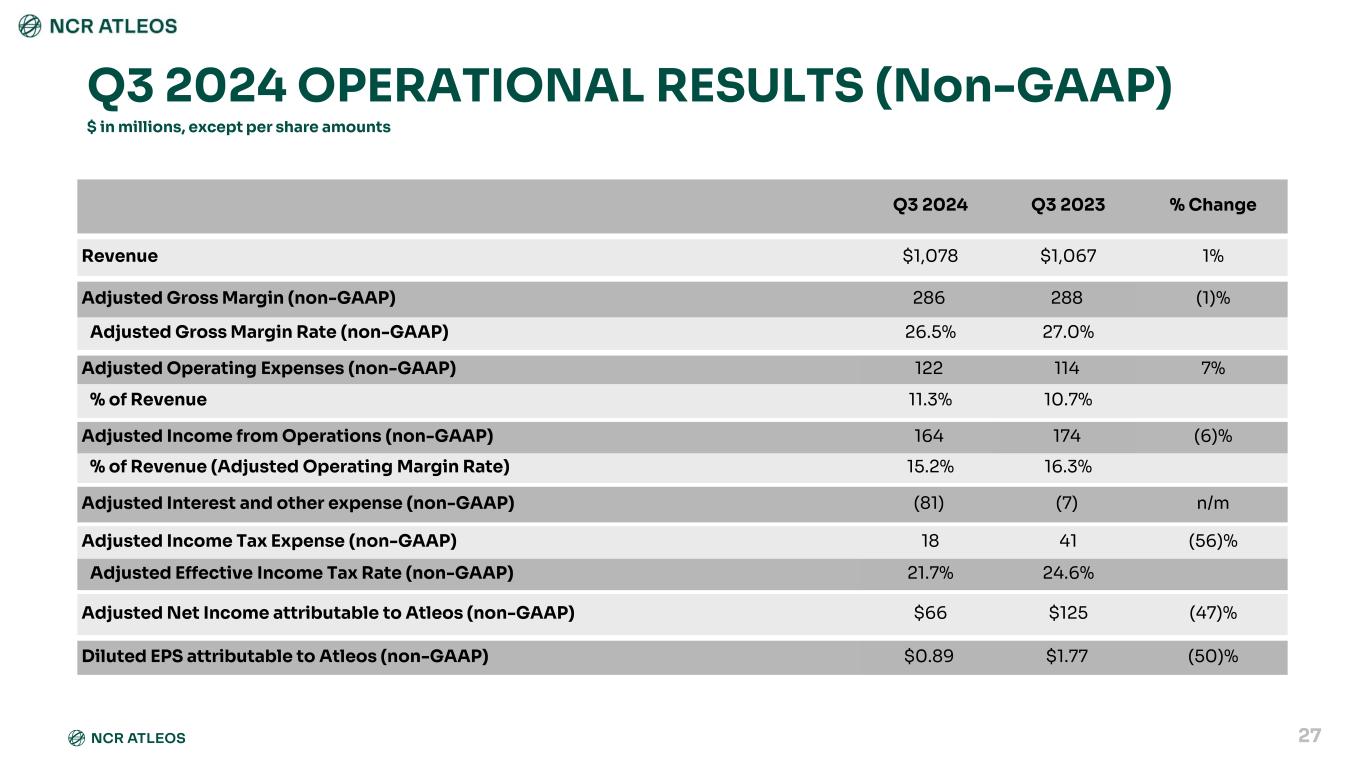 Q3 2024 Q3 2023 % Change Revenue $1,078 $1,067 1% Gross Margin 262 268 (2)% Gross Margin Rate 24.3% 25.1% Operating Expenses 143 177 (19)% % of Revenue 13.3% 16.6% Operating Income 119 91 31% % of Revenue 11.0% 8.5% Interest and other expense, net (82) (1) n/m Income Tax Expense 14 147 Effective Income Tax Rate 37.8% 163.3% Net Income attributable to Atleos $24 $(58) 141% Diluted EPS attributable to Atleos $0.32 $(0.82) 139% $ in millions, except per share amounts Q3 2024 GAAP RESULTS 26