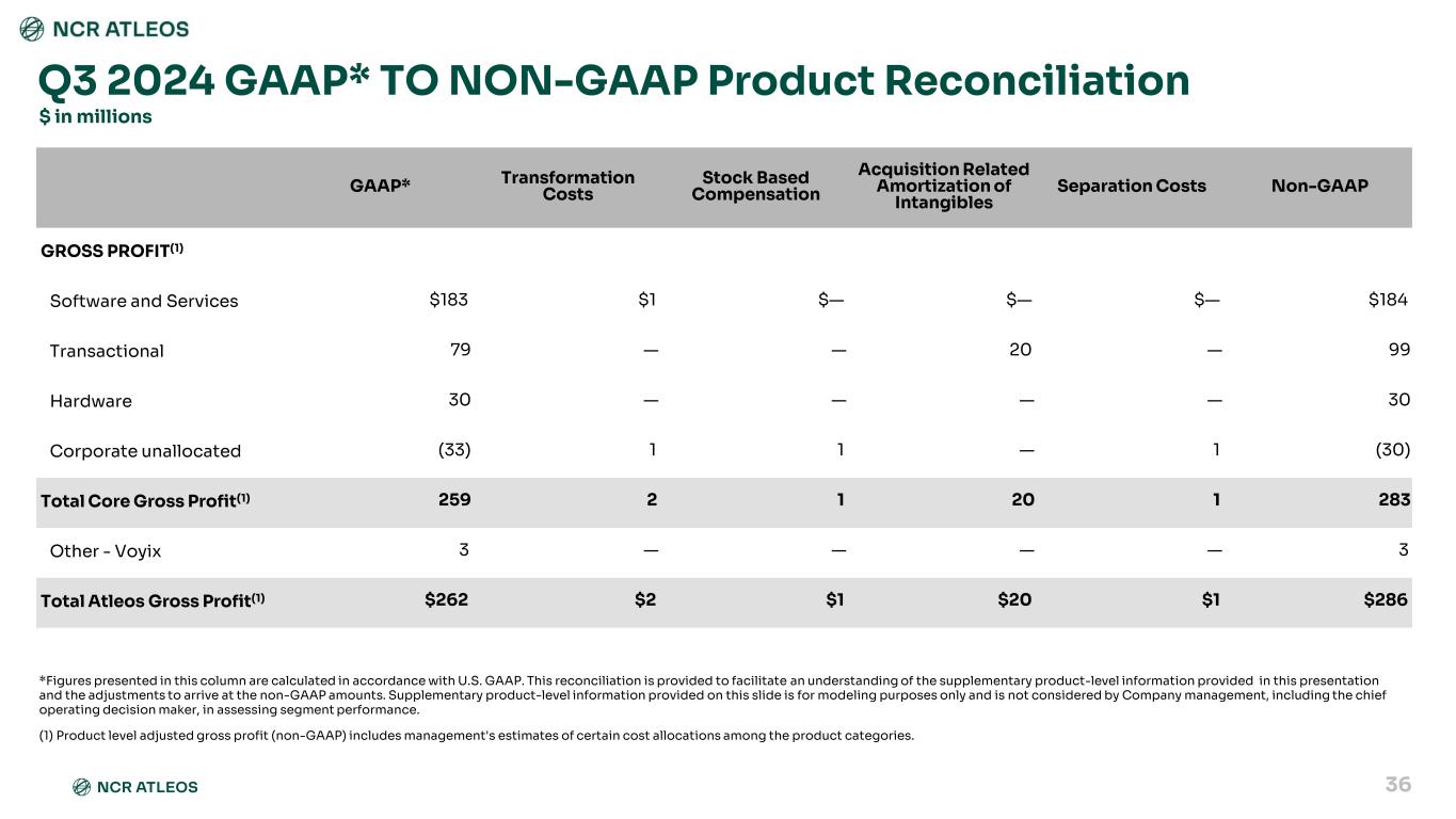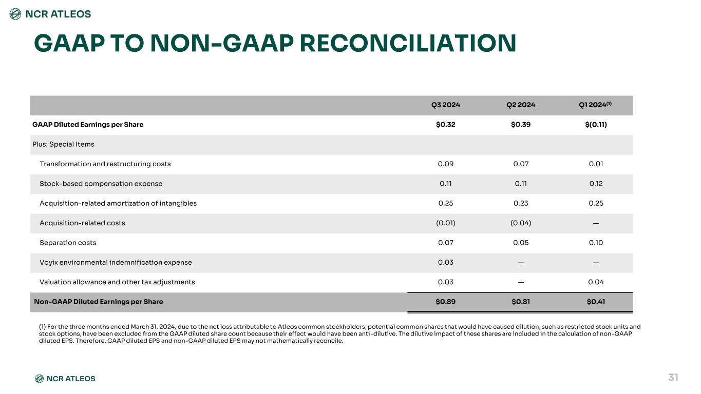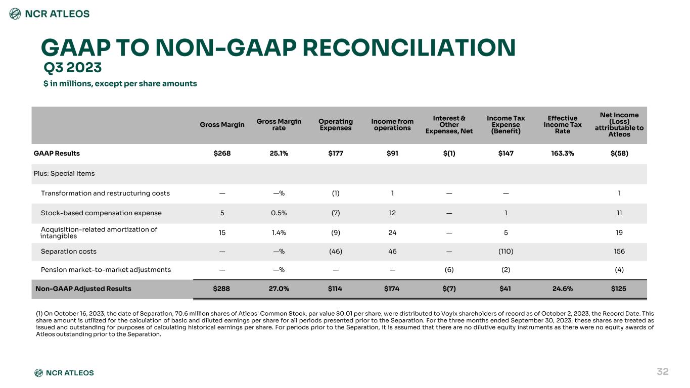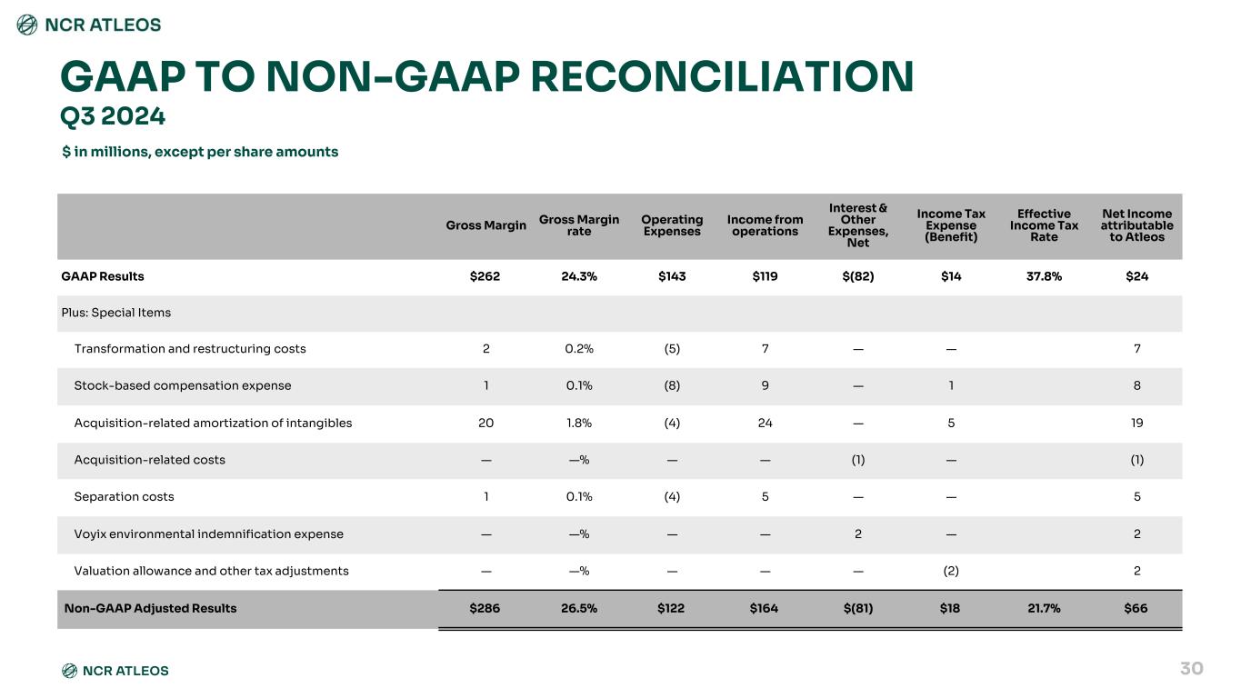 GAAP TO NON-GAAP RECONCILIATION $ in millions, except per share amounts Gross Margin Gross Margin rate Operating Expenses Income from operations Interest & Other Expenses, Net Income Tax Expense (Benefit) Effective Income Tax Rate Net Income attributable to Atleos GAAP Results $262 24.3% $143 $119 $(82) $14 37.8% $24 Plus: Special Items Transformation and restructuring costs 2 0.2% (5) 7 — — 7 Stock-based compensation expense 1 0.1% (8) 9 — 1 8 Acquisition-related amortization of intangibles 20 1.8% (4) 24 — 5 19 Acquisition-related costs — —% — — (1) — (1) Separation costs 1 0.1% (4) 5 — — 5 Voyix environmental indemnification expense — —% — — 2 — 2 Valuation allowance and other tax adjustments — —% — — — (2) 2 Non-GAAP Adjusted Results $286 26.5% $122 $164 $(81) $18 21.7% $66 Q3 2024 30