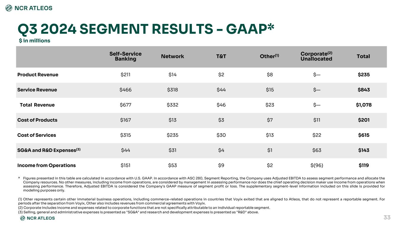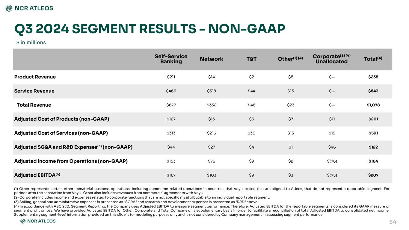 * Figures presented in this table are calculated in accordance with U.S. GAAP. In accordance with ASC 280, Segment Reporting, the Company uses Adjusted EBITDA to assess segment performance and allocate the Company resources. No other measures, including income from operations, are considered by management in assessing performance nor does the chief operating decision maker use income from operations when assessing performance. Therefore, Adjusted EBITDA is considered the Company's GAAP measure of segment profit or loss. The supplementary segment-level information included on this slide is provided for modeling purposes only. (1) Other represents certain other immaterial business operations, including commerce-related operations in countries that Voyix exited that are aligned to Atleos, that do not represent a reportable segment. For periods after the separation from Voyix, Other also includes revenues from commercial agreements with Voyix. (2) Corporate includes income and expenses related to corporate functions that are not specifically attributable to an individual reportable segment. (3) Selling, general and administrative expenses is presented as "SG&A" and research and development expenses is presented as "R&D" above. Self-Service Banking Network T&T Other(1) Corporate(2) Unallocated Total Product Revenue $211 $14 $2 $8 $— $235 Service Revenue $466 $318 $44 $15 $— $843 Total Revenue $677 $332 $46 $23 $— $1,078 Cost of Products $167 $13 $3 $7 $11 $201 Cost of Services $315 $235 $30 $13 $22 $615 SG&A and R&D Expenses(3) $44 $31 $4 $1 $63 $143 Income from Operations $151 $53 $9 $2 $(96) $119 Q3 2024 SEGMENT RESULTS - GAAP* $ in millions 33