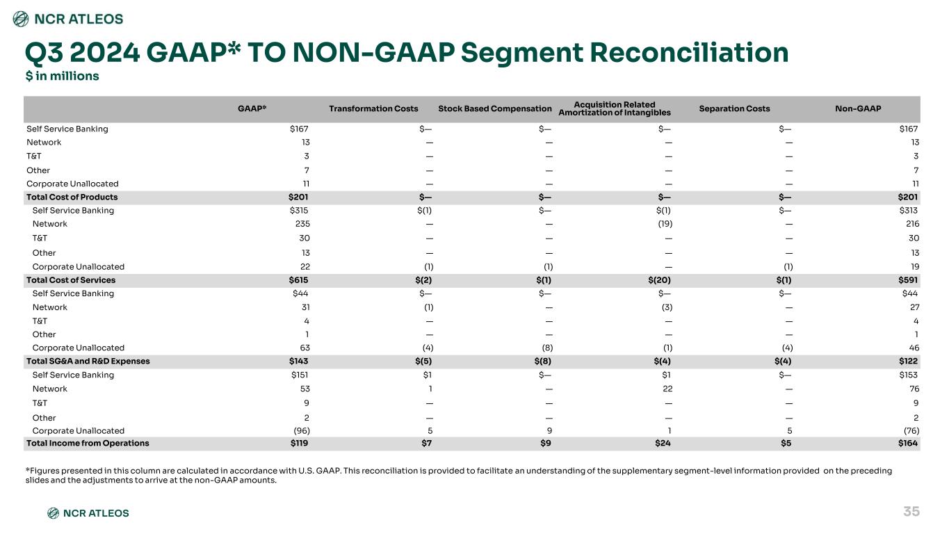 Self-Service Banking Network T&T Other(1) (4) Corporate(2) (4) Unallocated Total(4) Product Revenue $211 $14 $2 $8 $— $235 Service Revenue $466 $318 $44 $15 $— $843 Total Revenue $677 $332 $46 $23 $— $1,078 Adjusted Cost of Products (non-GAAP) $167 $13 $3 $7 $11 $201 Adjusted Cost of Services (non-GAAP) $313 $216 $30 $13 $19 $591 Adjusted SG&A and R&D Expenses(3) (non-GAAP) $44 $27 $4 $1 $46 $122 Adjusted Income from Operations (non-GAAP) $153 $76 $9 $2 $(76) $164 Adjusted EBITDA(4) $167 $103 $9 $3 $(75) $207 Q3 2024 SEGMENT RESULTS - NON-GAAP $ in millions 34 (1) Other represents certain other immaterial business operations, including commerce-related operations in countries that Voyix exited that are aligned to Atleos, that do not represent a reportable segment. For periods after the separation from Voyix, Other also includes revenues from commercial agreements with Voyix. (2) Corporate includes income and expenses related to corporate functions that are not specifically attributable to an individual reportable segment. (3) Selling, general and administrative expenses is presented as "SG&A" and research and development expenses is presented as "R&D" above. (4) In accordance with ASC 280, Segment Reporting, the Company uses Adjusted EBITDA to measure segment performance. Therefore, Adjusted EBITDA for the reportable segments is considered its GAAP measure of segment profit or loss. We have provided Adjusted EBITDA for Other, Corporate and Total Company on a supplementary basis in order to facilitate a reconciliation of total Adjusted EBITDA to consolidated net income. Supplementary segment-level information provided on this slide is for modeling purposes only and is not considered by Company management in assessing segment performance.