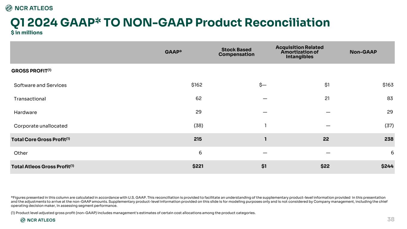 GAAP* Transformation Costs Stock Based Compensation Acquisition Related Amortization of Intangibles Non-GAAP GROSS PROFIT(1) Software and Services $170 $— $— $(1) $169 Transactional 76 — — 20 96 Hardware 37 — — — 37 Corporate unallocated (34) 3 1 — (30) Total Core Gross Profit(1) 249 3 1 19 272 Other 4 — — — 4 Total Atleos Gross Profit(1) $253 $3 $1 $19 $276 Q2 2024 GAAP* TO NON-GAAP Product Reconciliation $ in millions 37 *Figures presented in this column are calculated in accordance with U.S. GAAP. This reconciliation is provided to facilitate an understanding of the supplementary product-level information provided in this presentation and the adjustments to arrive at the non-GAAP amounts. Supplementary product-level information provided on this slide is for modeling purposes only and is not considered by Company management, including the chief operating decision maker, in assessing segment performance. (1) Product level adjusted gross profit (non-GAAP) includes management's estimates of certain cost allocations among the product categories.