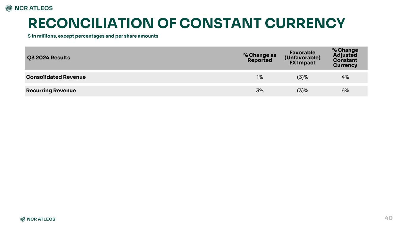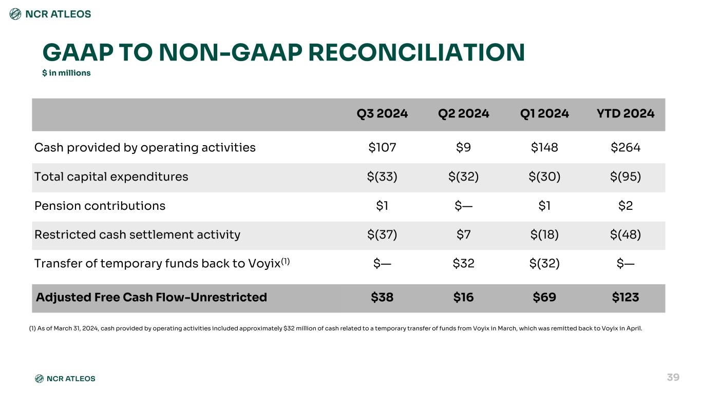 Q3 2024 Q2 2024 Q1 2024 YTD 2024 Cash provided by operating activities $107 $9 $148 $264 Total capital expenditures $(33) $(32) $(30) $(95) Pension contributions $1 $— $1 $2 Restricted cash settlement activity $(37) $7 $(18) $(48) Transfer of temporary funds back to Voyix(1) $— $32 $(32) $— Adjusted Free Cash Flow-Unrestricted $38 $16 $69 $123 $ in millions GAAP TO NON-GAAP RECONCILIATION 39 (1) As of March 31, 2024, cash provided by operating activities included approximately $32 million of cash related to a temporary transfer of funds from Voyix in March, which was remitted back to Voyix in April.
